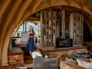 At Bisate Reserve, the architecture itself tells a story. Inspired by the traditional homes of Rwanda’s tribal chiefs, the villas reinterpret royal design in a modern, luxurious form. Each cocoon-like structure rises from the forest with woven thatch, volcanic stone, timber floors and basket-weave ceilings crafted by local artisans. Inside, the decor celebrates Rwanda’s artistry, from imigongo-inspired geometric patterns to handwoven reed matting, pottery and dramatic works by Rwandan artists depicting the gorillas of the Virungas. Pathways are paved with hand-chipped volcanic rock and vast windows frame the volcanoes themselves, blurring the line between lodge and landscape. The result is a retreat that feels regal yet grounded, connecting guests to both Rwanda’s heritage and its wild terrain.